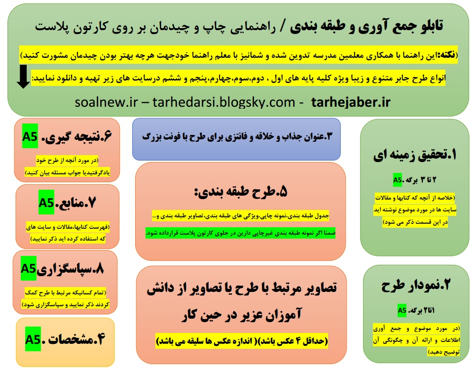 1. تحقیق زمینه ای 2. نمودار طرح3.عنوان فانتزی4. مشخصات طرح5. شرح طبقه بندی6.نتیجه گیری7.منابع8.سپاسگزاری و تصاویر مرتبط با طرح و راهنما چاپ چسباندن و دفترکارنما
