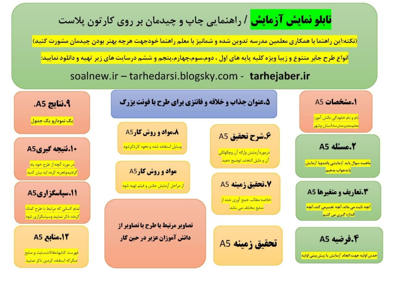 1. مشخصات طرح 2. مسئله3.تعاریف و متغیرها4. فرضیه 5. عنوان6.شرح تحقیق7.تحقیق زمینه8.مواد و روشکار9.نتایج10.نتیجه گیری11.سپاسگزاری12.منابع و تصاویر مرتبط با طرح و راهنما چاپ چسباندن و دفتر کارنما و گزارش کتبی
