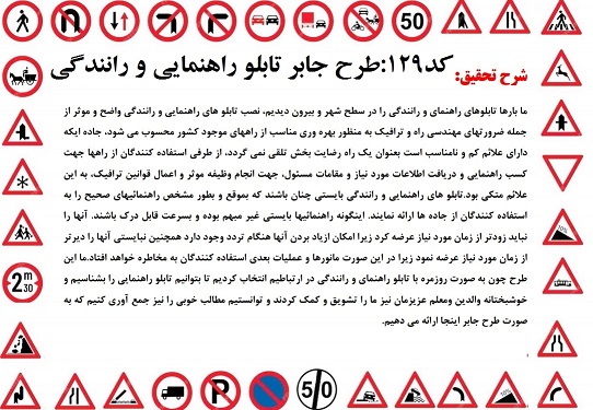ما بارها تابلوهای راهنمای و رانندگی را در سطح شهر و بیرون دیدیم، نصب تابلو های راهنمایی و رانندگی واضح و اینگونه راهنمائیها بایستی غیر مبهم بوده و بسرعت قابل درک باشند. ما این طرح چون به صورت روزمره با تابلو راهنمای و رانندگی در ارتباطیم انتخاب کردیم تا بتوانیم تابلو راهنمایی را بشناسیم و خوشبختانه والدین ومعلم عزیزمان نیز ما را تشویق و کمک کردند و توانستیم مطالب خوبی را نیز جمع آوری کنیم که به صورت طرح جابر اینجا ارائه می دهیم....... ادامه مطالب پس از خرید طرح قابل مشاهده خواهد بود.
